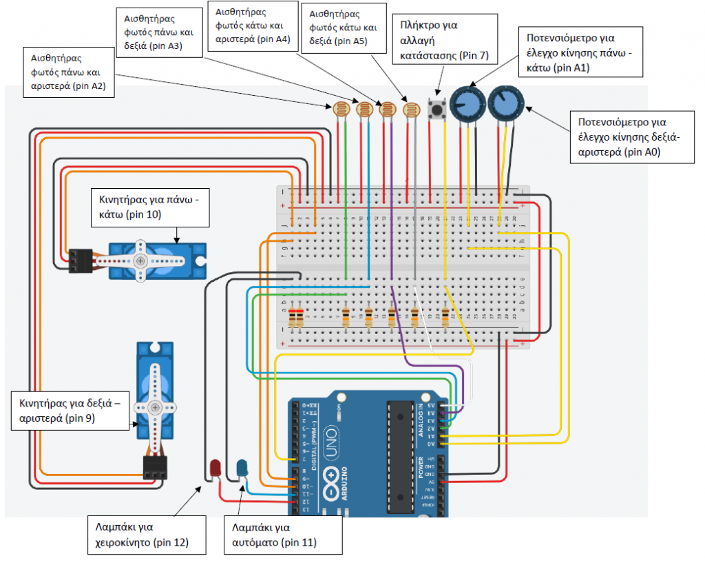 Για αυτόν τον λόγο προγραμματίσαμε την συσκευή να αλλάζει κατάσταση με την χρήση ενός push button και να μας ειδοποιεί για την κατάσταση με δύο φωτάκια led. Το πρόγραμμα έγινε με την χρήση της πλατφόρμα tinkercad. Μπορείτε να κατεβάσετε ένα pdf με την επεξήγηση του προγράμματος εδώ:Κώδικας φωτοβολταικού